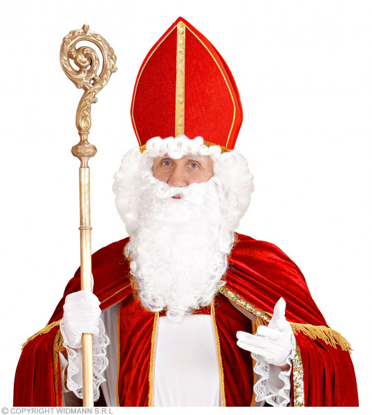 Welurowa czapka biskupia to mitra św. Mikołaja w kolorze czerwonym. Jest ona wykończona złotymi, błyszczącymi zdobieniami. Z tyłu na plecy opadają dwa dekoracyjne pasy o długości 30 cm, zakończone frędzlami.